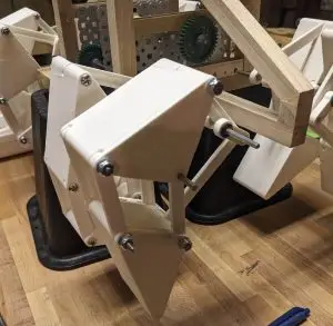 • The design draws heavy inspiration from the Strandbeest. The legs use the linkage designed by Theo Jansen.